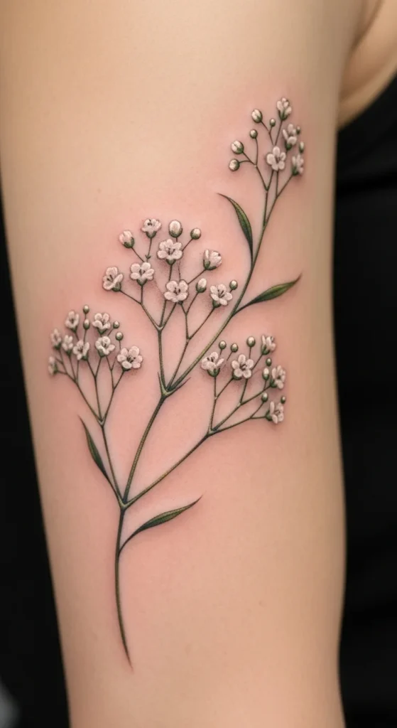 Baby’s breath gives a soft, airy feel. It pairs well with upper arm placement because the shape can spread gently without taking over. Sketch small dot clusters and connect them with thin stems to see how they curve. Keep clusters spaced out for clarity. For a budget-friendly session, stick to outlines or light dot shading. Baby’s breath looks lovely as a filler piece if you plan a larger collection later. This area provides a smooth canvas, helping fine lines stay crisp. If you want symbolism, arrange three clusters to represent important people or moments. Soft aftercare helps the thin lines stay clear during healing.