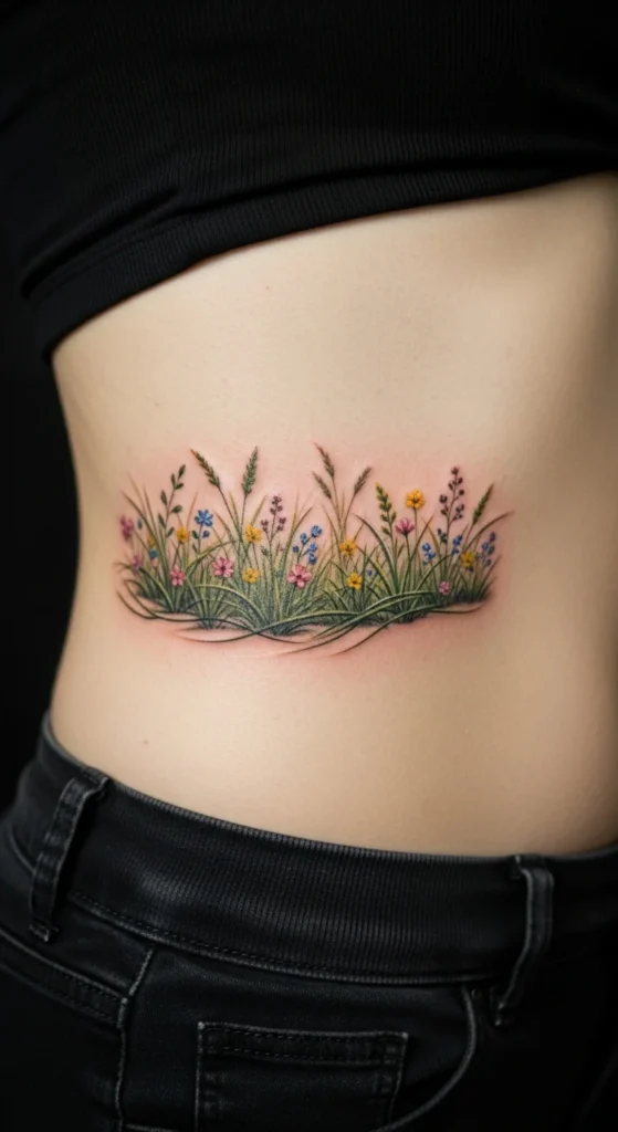 A meadow scene brings a peaceful feel, especially on the rib flank where long shapes flow naturally. Start with a simple sketch of three or four flower types and light grass strokes. Tape the sketch to your side and breathe deeply to see how it moves. These designs look best when kept minimal rather than dense. If you want to save money, choose fewer flower types. Stick to black ink for clarity. Meadows look lovely with gentle upward motion. The rib area can be sensitive, so keeping the design light makes the session shorter. Loose tops help during healing. This tattoo suits anyone who loves nature-inspired pieces that feel soft and personal.