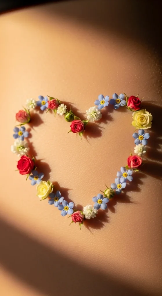 A floral heart near the hip bone brings a soft, intimate feel. Choose small flowers that hold shape clearly, like daisies or tiny buds. To preview, draw a heart outline and place tiny floral stickers around it. If you want a simple session, keep the heart open with only a few blossoms. This design suits black ink well and holds up better than using many colors. The hip bone area may feel tender, so keep the design light. Wear soft waistbands during healing. A floral heart works beautifully alone or as a future expansion piece.