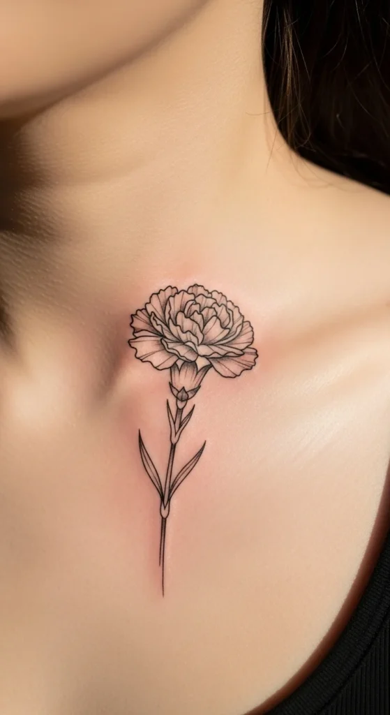 Birth month flowers feel personal, and carnations bring a warm touch for anyone born in January. The collarbone fits this style because the bloom can follow the bone’s curve. Start by tracing your collarbone lightly with eyeliner, then sketching a small carnation outline to see how it sits. If you like symmetry, mirror a smaller leaf on the opposite side. This area allows for slightly larger flowers without looking heavy. For a budget-friendly option, stick to black and grey; carnations look clear even without color. You can also shorten the stem to keep the design small and clean. This spot heals smoothly as long as you avoid tight straps for a few days. If you want symbolism, pair the carnation with one tiny dot above it, representing a milestone or someone special. Keep lines spaced comfortably to help them age gracefully.