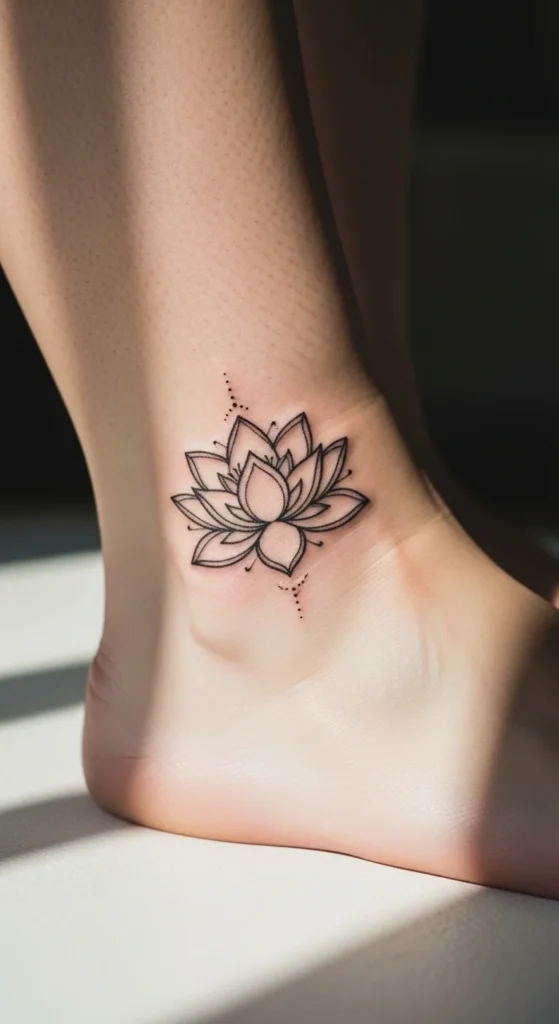 A lotus ankle tattoo gives a quiet spiritual touch without taking much space. The ankle works well for designs under two inches, especially if you like fine lines. To test placement, wrap a thin paper band around your ankle and draw the lotus on it. Wear it for an hour to see how it feels with shoes. Keep the design simple—three to five main petals are enough. If you’re watching your budget, skipping shading makes the session faster. A lotus also pairs well with a tiny crescent or dot cluster if you want light personal symbols. The ankle moves often, so keep the size slightly larger than you think to prevent blur as it ages. Moisturize the skin for a week before your appointment for smoother lines. This tattoo sits well with sandals and works year-round with subtle visibility.