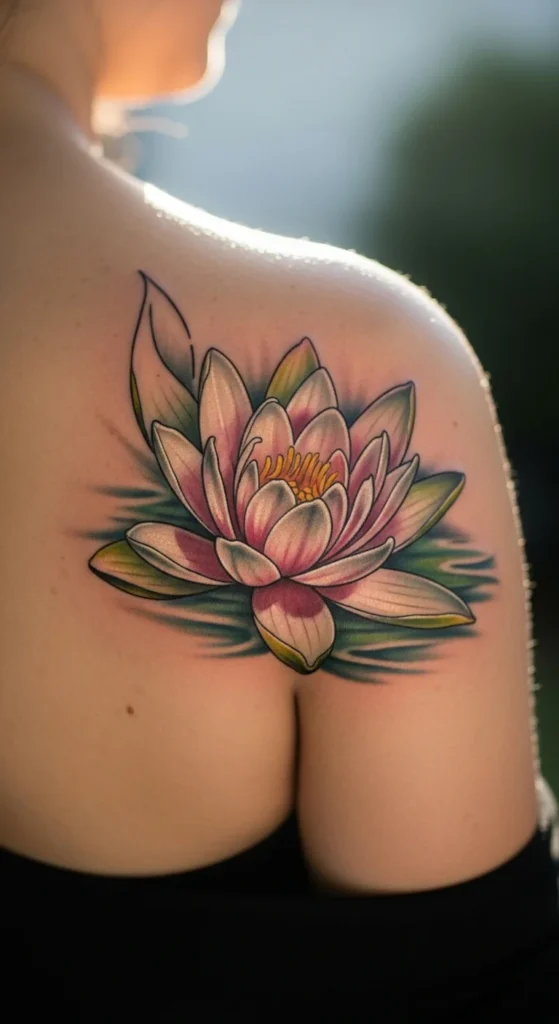 Water lilies feel peaceful and gentle, making them a sweet pick for the back of the shoulder. This spot holds medium-sized designs without feeling heavy. Sketch two lily shapes on paper and place them on your shoulder blade to see the angle you prefer. Many people tilt the bloom toward the arm so it peeks under straps. For an affordable session, focus on the main bloom and skip additional leaves. Black and grey works beautifully for lilies because the petal layers create natural depth. If you like more softness, ask for light gradient shading instead of detailed texture. To test movement, rotate your shoulder in the mirror while holding the sketch in place—you’ll see how the design shifts with motion. This placement heals well, though sleeping on your back might feel tricky for a week. Keep loose shirts nearby to avoid rubbing.