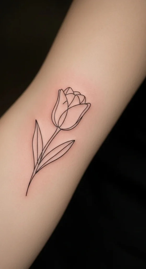 A single-line tulip offers clean simplicity while still holding meaning. The tulip shape works perfectly for a continuous stroke, making the design soft but expressive. To plan the look, draw the tulip using one motion on scrap paper until the curve feels natural. Hold it against your arm to preview flow. These tattoos fit well on the inner forearm or upper arm. They look timeless in black ink and take less time to finish, which helps keep the price low. Avoid adding many leaves or loops; a small curve under the bloom is enough. The beauty of this style comes from the clean gesture. If you want to personalize it, add one short dot line near the stem to mark a special year or memory. Once healed, apply a thin layer of unscented lotion to maintain softness. Simple designs tend to age clearly, especially when spaced well.