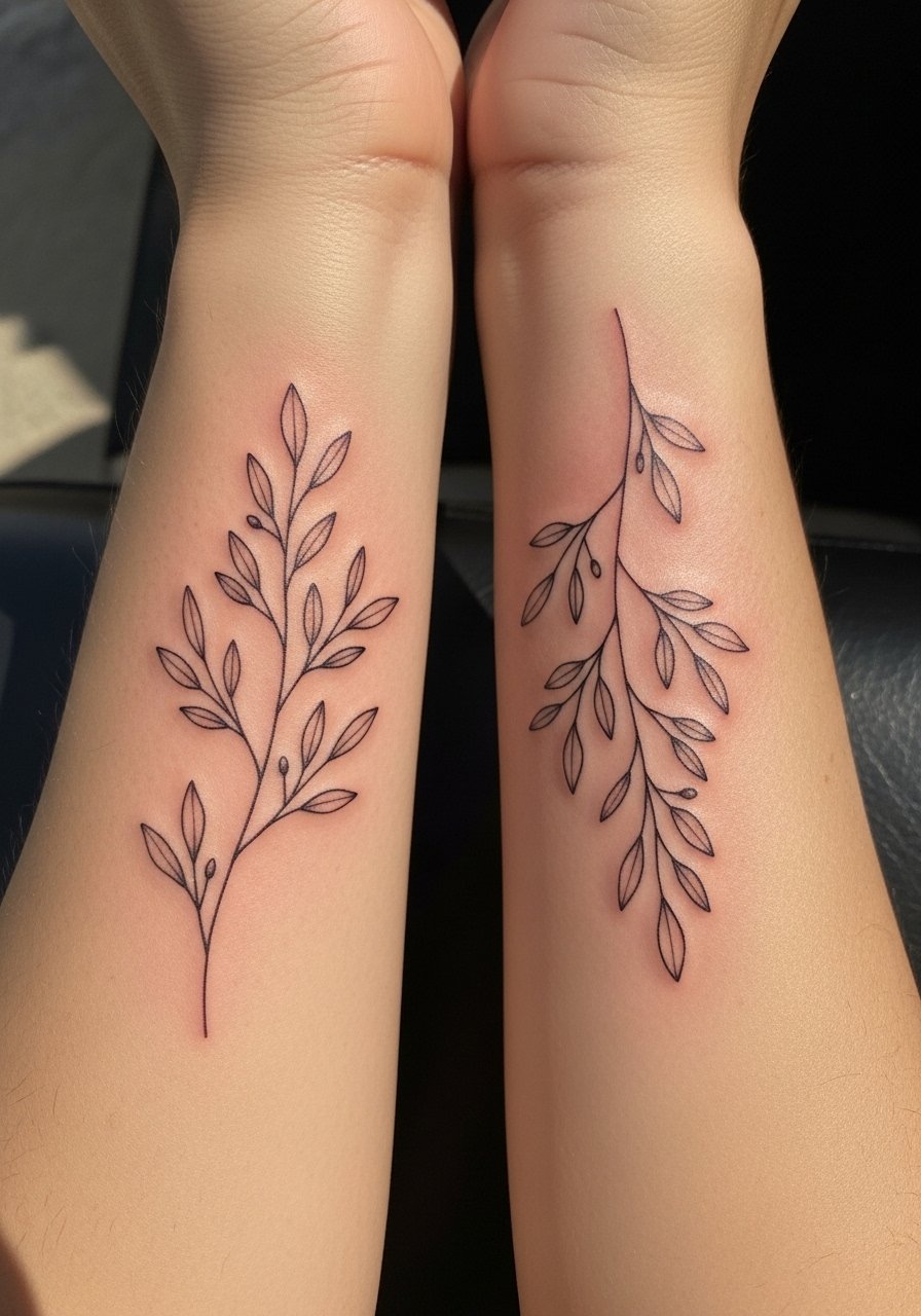 I love matching delicate sprigs because they read personal without shouting. Fine line gives a gentle, intimate feel—perfect for friends who want the same motif without identical scale. Inner forearm placement is forgiving and heals predictably. Expect light soreness during inking and a week of scabbing; lines can blur slightly over years if too thin. Ask your artist for slightly varied line weight so the two pieces feel cohesive but unique. Common mistake: going too tiny with single hairline strokes—give the leaves a bit of thickness so they stay crisp healed.