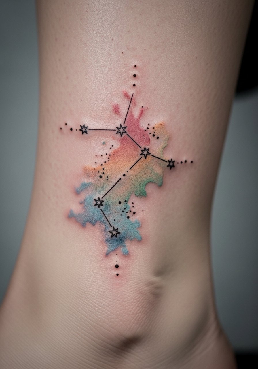 Constellations in watercolor feel dreamy and can represent a shared night or inside joke. Ankles are fairly painful for some due to bone proximity and take about 2 weeks to surface-heal. Watercolor fades faster than black, so plan for possible touch-ups. Ask the artist to anchor the piece with fine black stars so the composition remains readable as colors soften. Don't request tiny water splashes with zero contrast—watercolor needs a graphic anchor to last.