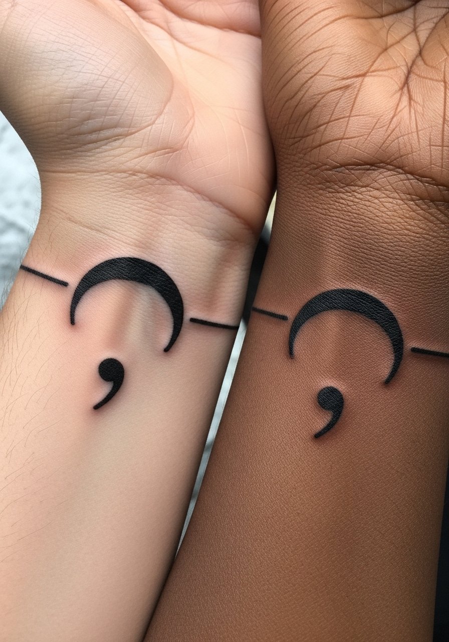 Semicolon tattoos carry strong emotional meaning for many friends—discrete and powerful. A small semicolon band around the wrist reads like jewelry and is low-pain. These hold well if lines are bold enough; ultra-thin bands can fade into faint lines. I recommend asking the artist to slightly thicken the mark so it remains a clear symbol years out. Keep the area moisturized and avoid picking any scabs during the week of healing.