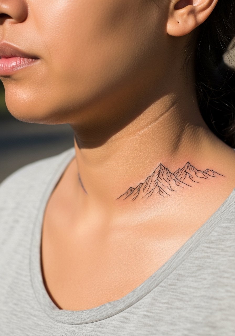 A slim mountain silhouette across the collarbone feels like a shared promise to climb together. Collarbone can be stingy—expect higher pain as the needle crosses bone. Heals in 1-2 weeks on the surface but full settling is months. Thin lines need slight weight so peaks don't blur; otherwise the signature look is kept. Common mistake: placing the range too close to clavicle topography—work with your artist to contour the piece to your anatomy.