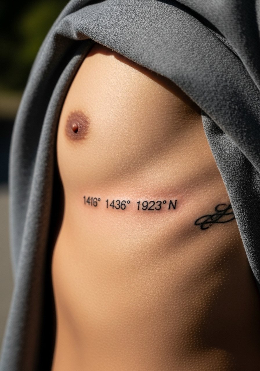 Coordinates are discreet and deeply personal—great for friends who share a place that matters. Ribcage is a higher-pain area and can take longer to heal due to movement and clothing friction. Keep sessions shorter and plan for proper aftercare; expect tenderness when breathing for a few days. For longevity, pick a clean, slightly bold numeric font so digits remain legible after skin settling. Ask to see healed ribcage numbers from the artist first.