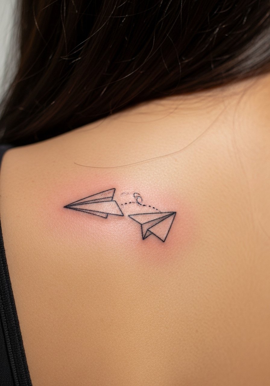 Paper planes are playful and carry nostalgic weight. Behind the shoulder is moderate pain and heals with minimal daily friction. These are great when friends want the same symbol without exact mirroring—scale or trajectory change keeps pieces individual but related. Lines should be slightly thicker than ultra-fine to avoid loss of shape. Avoid tiny dashed trails that can blur into a smudge; ask for a clean, simple path.