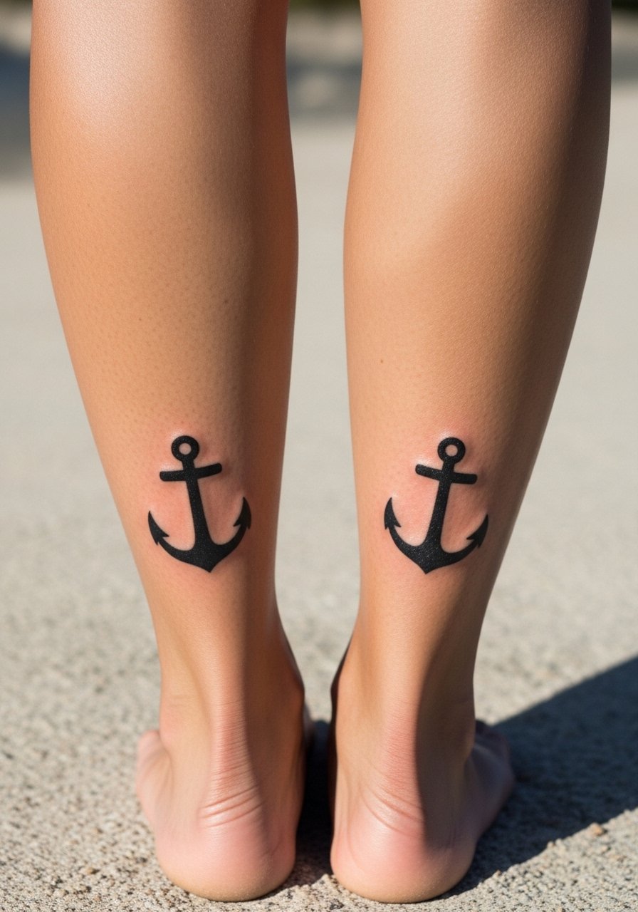 Anchors symbolize stability and have a timeless look. Calves are low-pain and ideal for slightly larger matching marks. Solid black silhouettes maintain clarity and resist fading better than tiny color fills. If you want color, keep it simple. Avoid over-detailing the anchor's interior—silhouette strength is the point. Calf placement is easy to show during warm months and hides under pants.