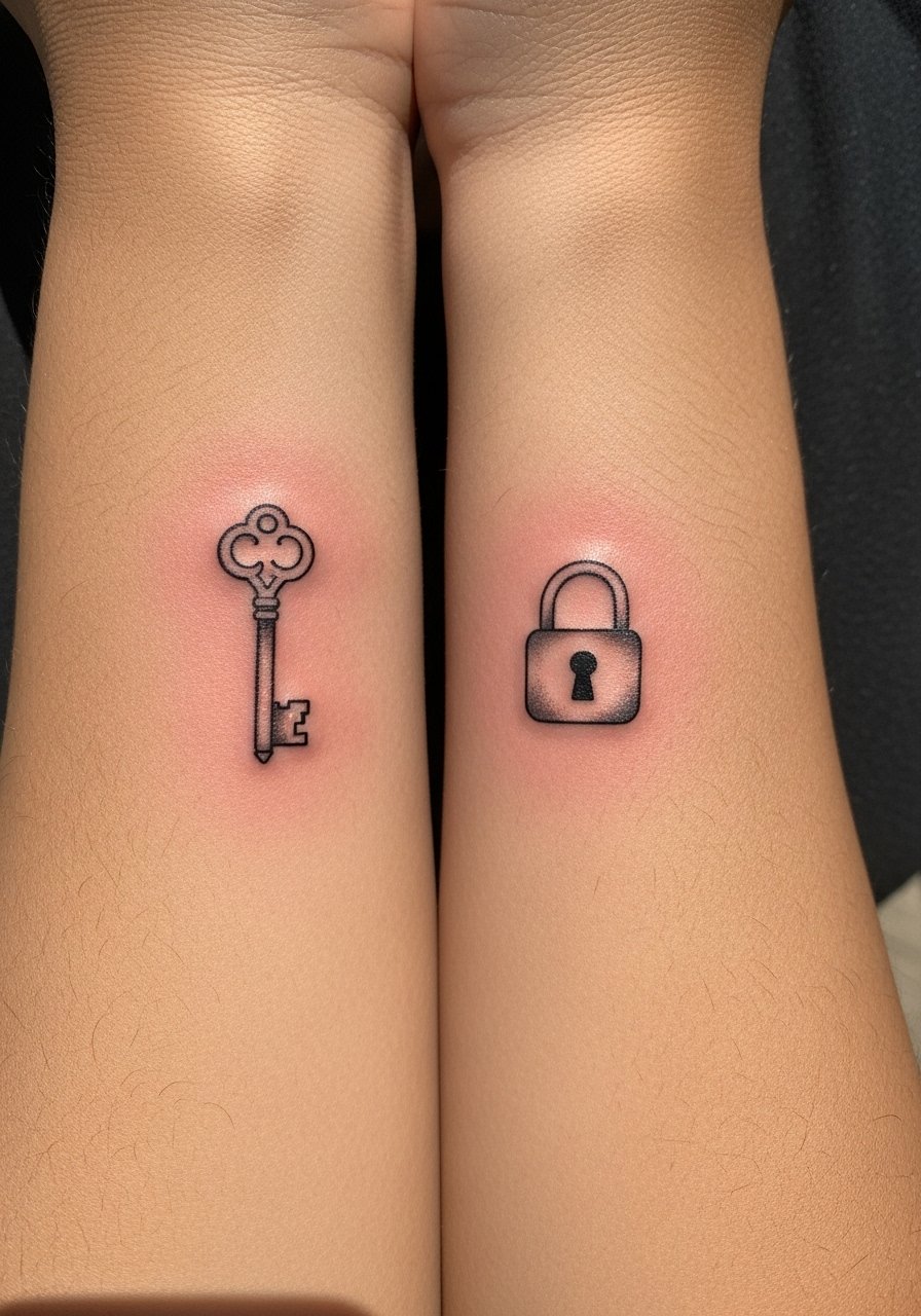 Key-and-lock pairs read like a shared secret—one friend gets the key, the other the lock. Inner arm placement is low-pain and sits flat for easy healing. Simple silhouettes keep the idea readable; avoid tiny ornate details that won't survive healing. Ask for slightly bolder outlines to preserve shape over time. Placement symmetry can be exact or mirrored depending on how you want the connection to look.