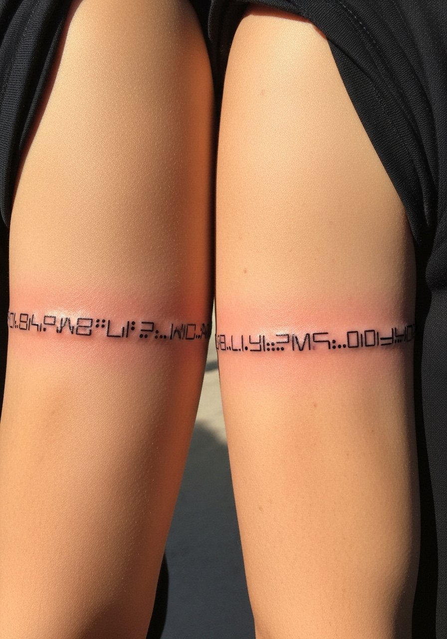 Encoded messages in Morse code make for a private, meaningful bond. Upper arm bands sit well and hurt less than inner arm or ribs. Precision in spacing is critical—ask the artist to stencil spacing exactly to prevent lines from running together later. Bolden the dots and dashes slightly to keep separation after healing. This is a low-visibility, high-meaning option.