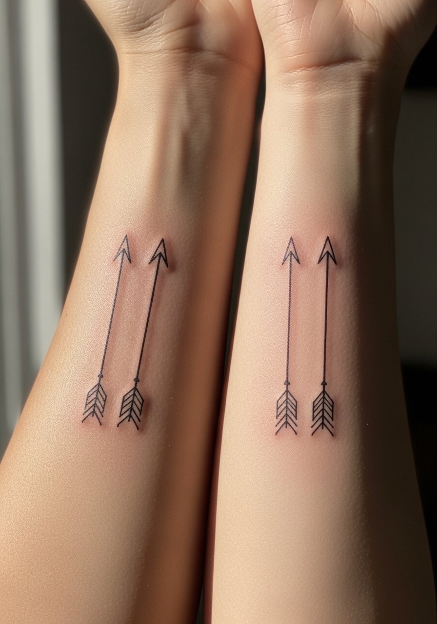 Parallel arrows symbolize moving forward or protection. Forearms are versatile and relatively low-pain. Keep the shaft and head simple—intricate fletching doesn’t hold well at small scales. Slightly bold shafts keep the shape intact; arrows that are too thin can blur. This is a good option for friends who want visible, coordinated pieces.