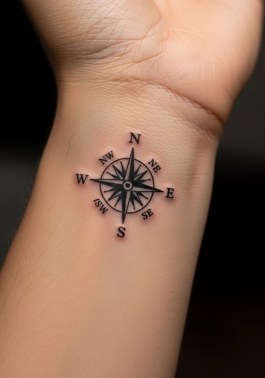 A tiny compass is a neat metaphor for direction and shared guidance. The inner wrist is sensitive but straightforward to care for. For durability, avoid ultra-thin needlework on the tiny directional points—ask for slightly thicker points so cardinal markers remain distinct. This design works well as a matching small presence.