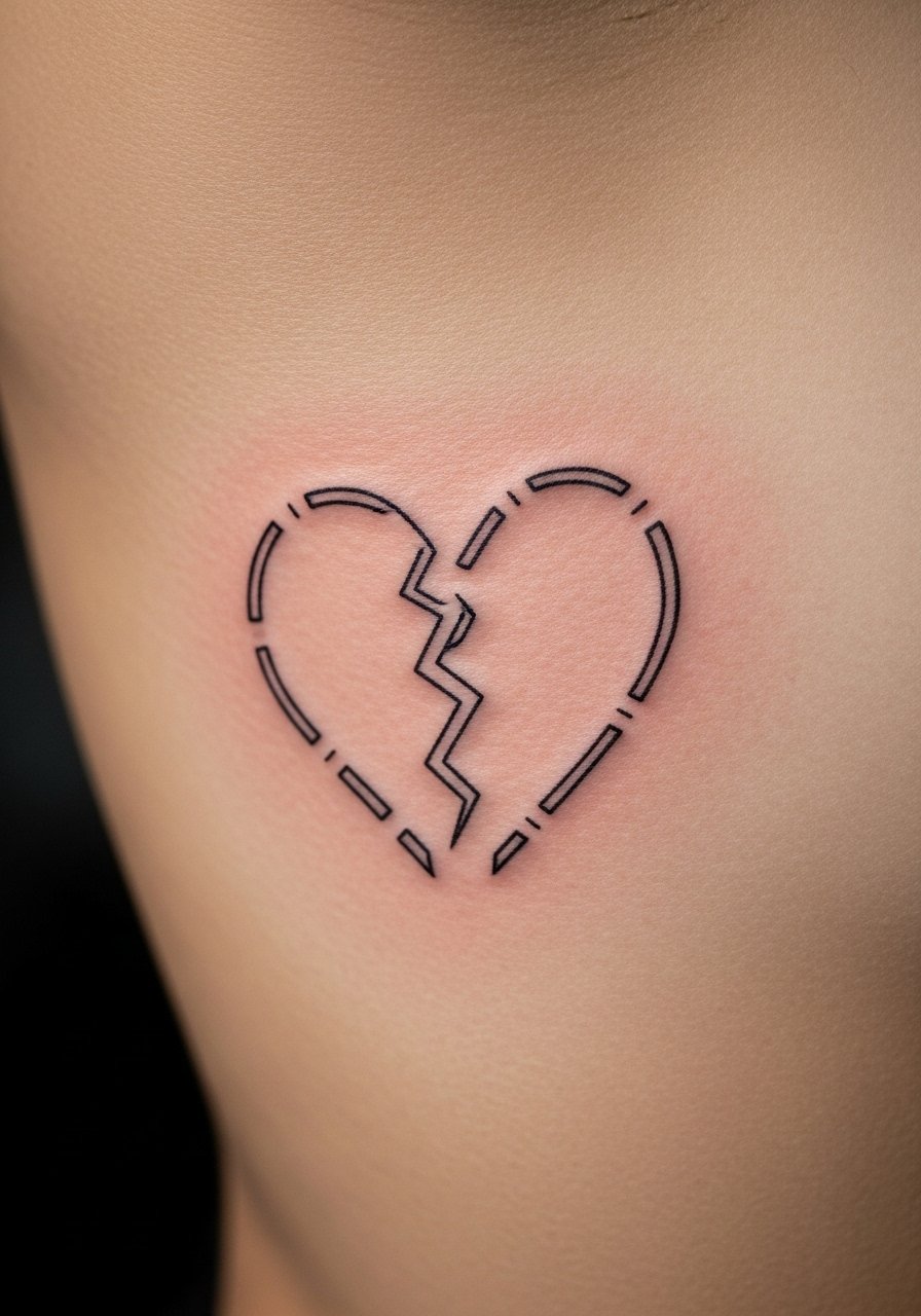 A broken-line heart can represent hardship and healing you faced together. Rib placement means higher pain and careful aftercare. The linework should be bold enough so gaps remain intentional, not accidental. The common mistake is splitting the line so finely that healing fills the negative space—ask your artist to space the breaks deliberately for long-term clarity.