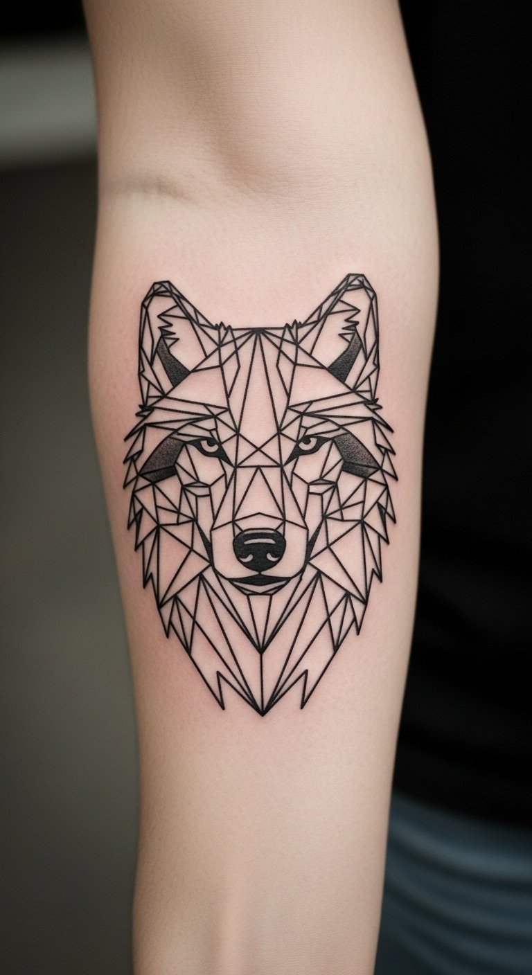 A wolf rendered in geometry feels smart and symbolic. Forearm is stable skin and shows off clean line work. Expect localized soreness during the session. Fine-line fur details need a skilled hand so the shapes stay crisp while aging. Avoid overcrowding the face area with texture. Look for artists who post geometric wolf healed shots.