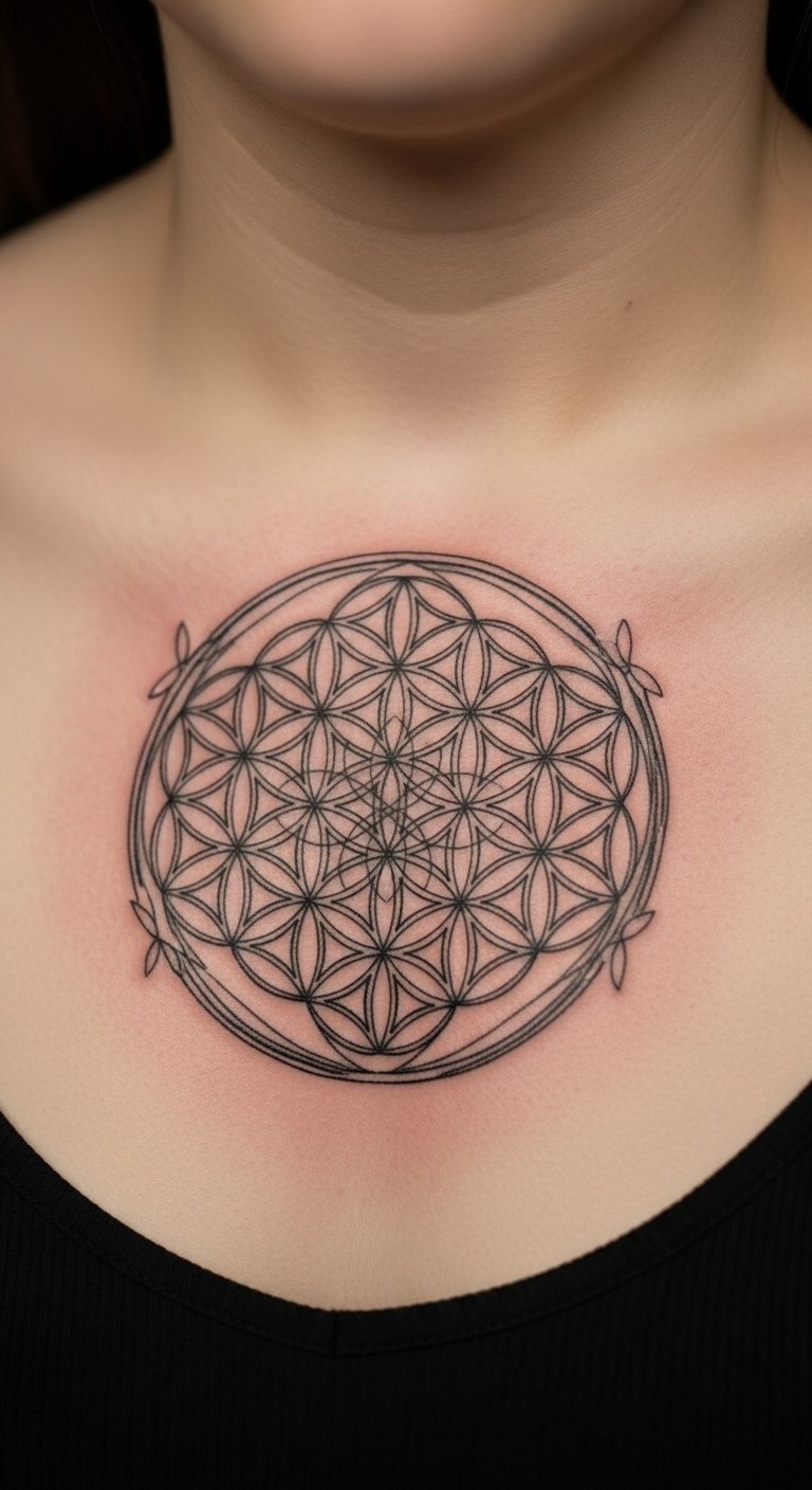 The Flower of Life reads as unity and structure. The chest's curvature can enhance symmetry if mapped to the sternum. Expect a bit more tenderness near bone. Fine-line versions need artist precision; otherwise lines can spread. Common mistake: placing too small over the sternum. Ask to preview a full-size stencil and discuss geometric mandala meaning.