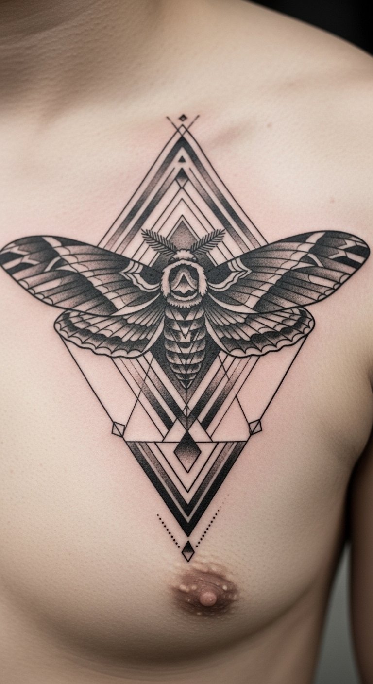 Death moths combine transformation symbolism with precise geometry. The pectoral provides a broad, stable area. Expect moderate pain near the sternum. Shading and shapes hold well if black ink dominates. Mistake: too much tiny stippling that fades unevenly. Ask your artist for matching blackwork examples.