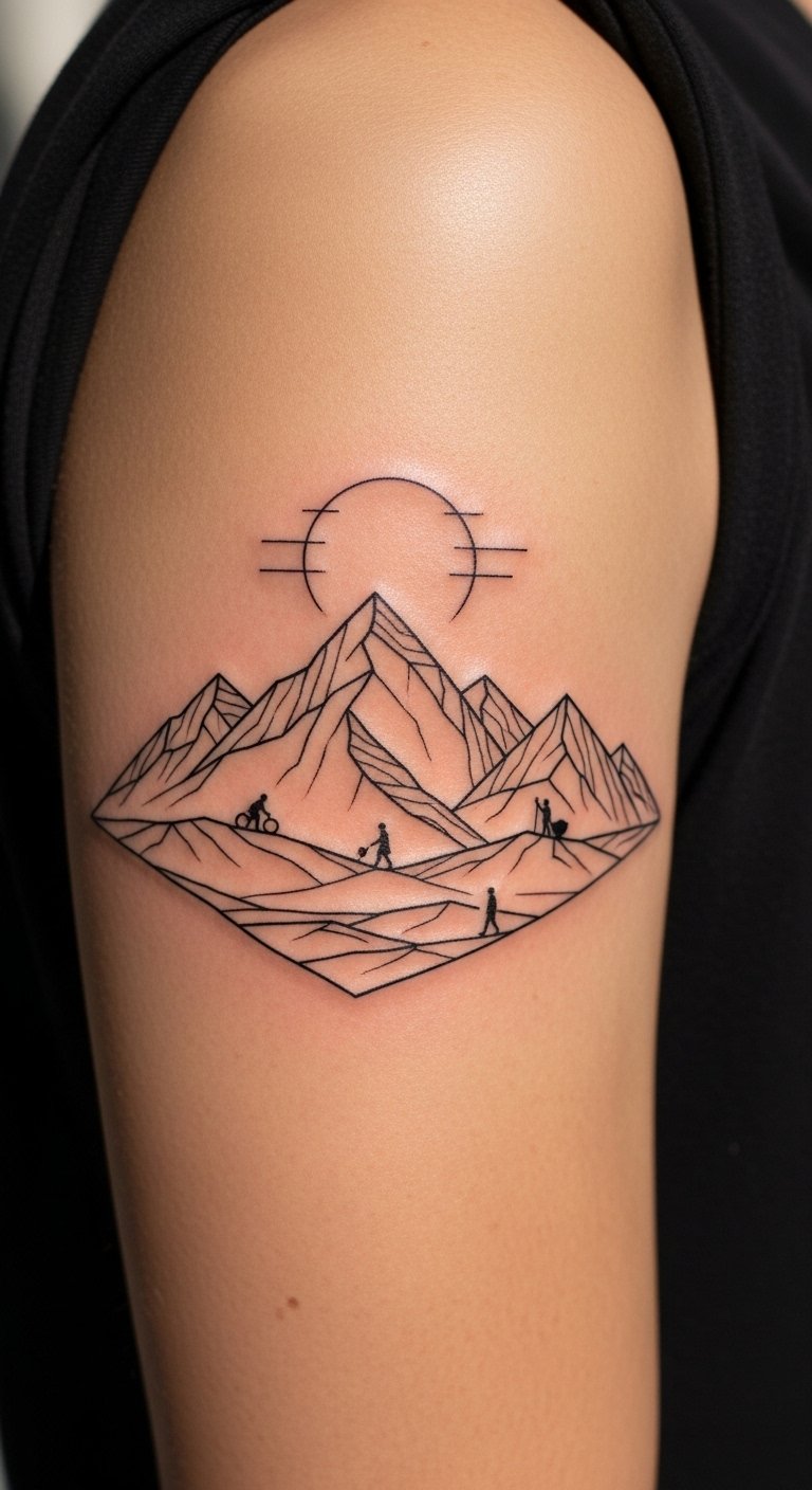 Mountains done with geometry read modern and personal. Upper arm contours keep lines stable. Expect modest soreness and straightforward healing. Keep contrast high so fine ridgelines don’t wash out. I like artists who mix realism elements with geometry for storytelling.
