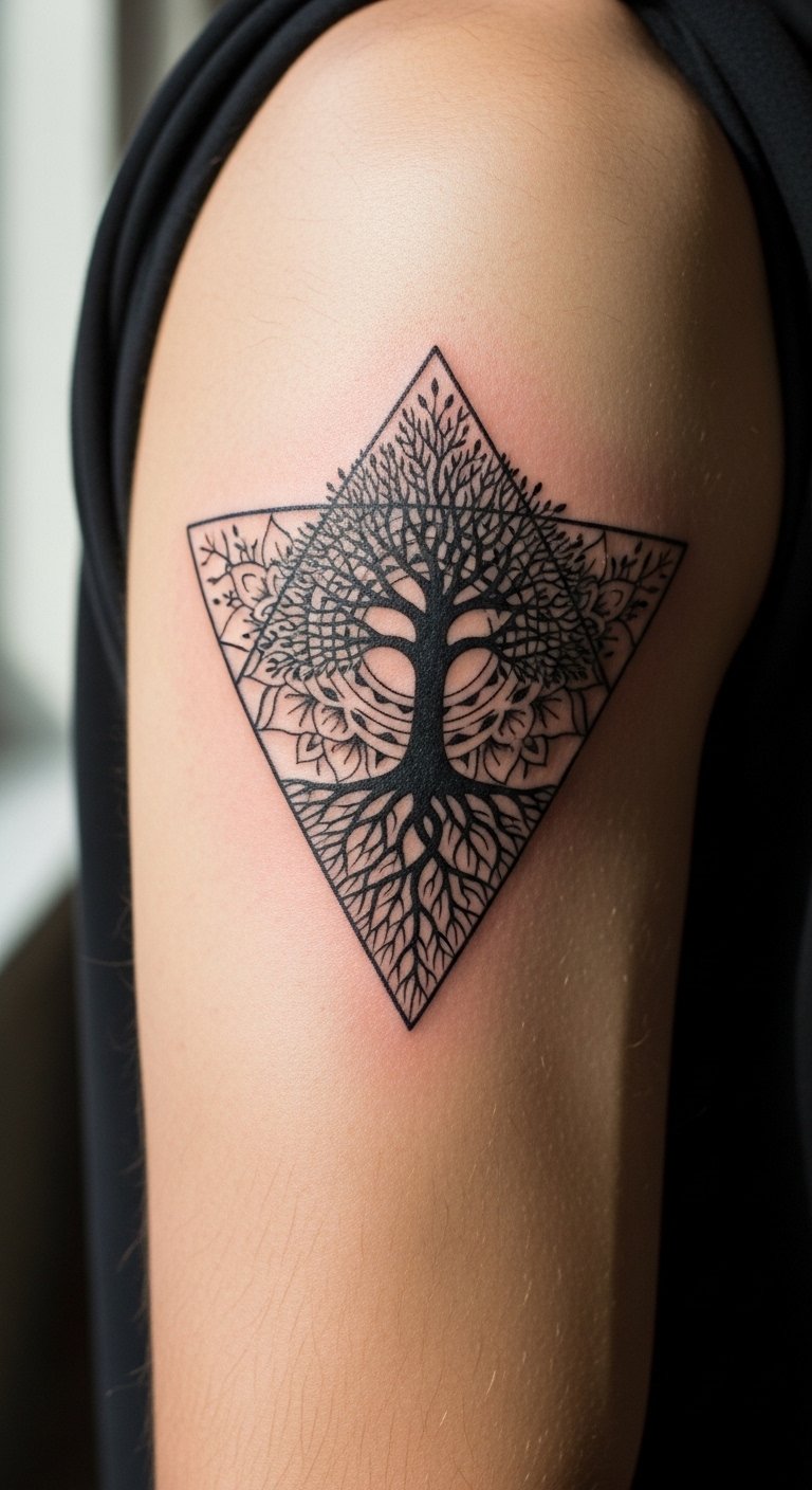 This blends organic symbolism with strict forms. Bicep muscle movement flatters triangles. Expect normal soreness and solid aging if lines are bold enough. Common mistake: tiny branches in the mandala center that get muddy over time.