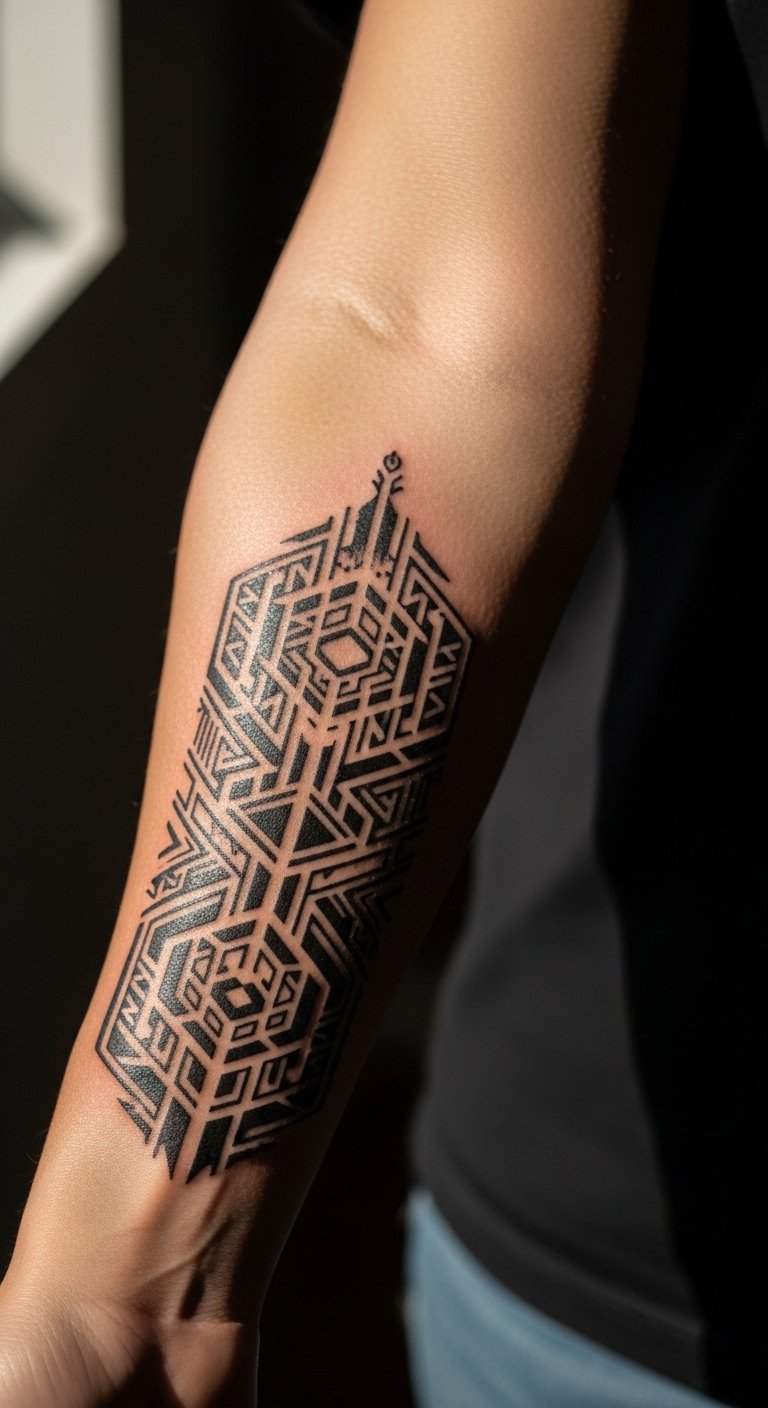 Hex patterning nods to tribal roots while staying modern. Forearm placement keeps shapes legible as you move. Keep negative space intentional. Overfilling small gaps is a common error. Ask for healed forearm portfolios.