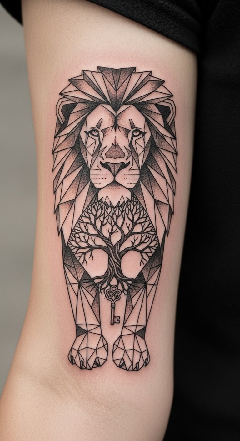 Geometric Lion With Tree And Key On Arm