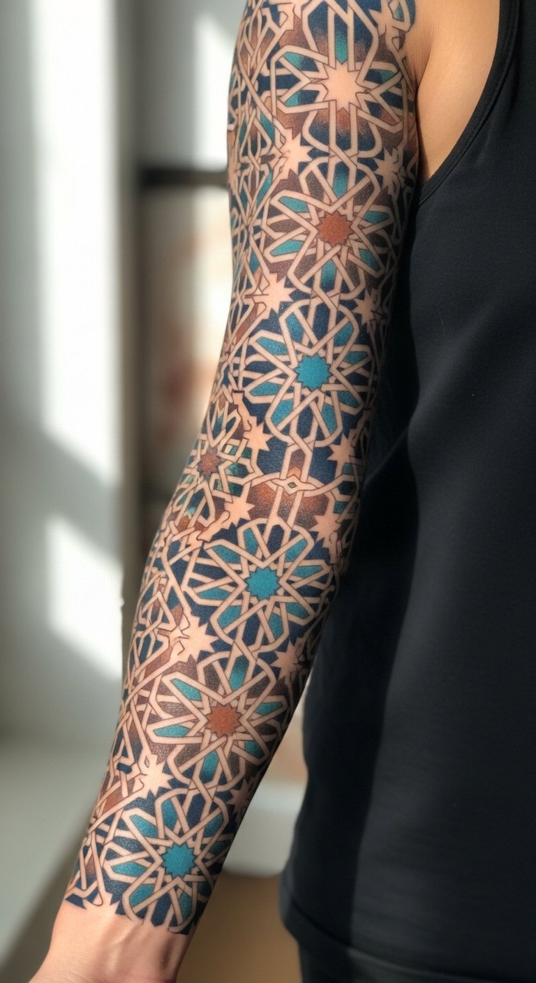 I love bringing Old World tile patterns into modern sleeves. Patterns should respect cultural origins. Follow muscle contours to keep symmetry. Mistake: ignoring negative space — mosaics need breathing room.