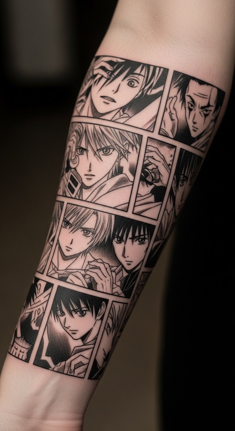 Abstracting pop-culture scenes into panels keeps the reference subtle and stylish. Forearms show detail well. Avoid direct copies or copyrighted prints; make it personal. Artists like @kimi_tattooist do great panel work.