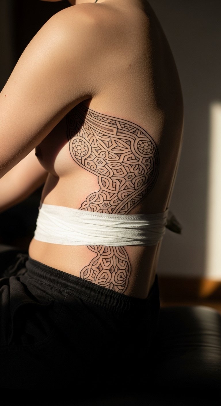 Continuity patterns across the ribcage feel like a meditative map. Ribs are painful and need careful aftercare. Keep lines bold enough to survive stretch and movement. Avoid over-fine meshes that fuzz early.