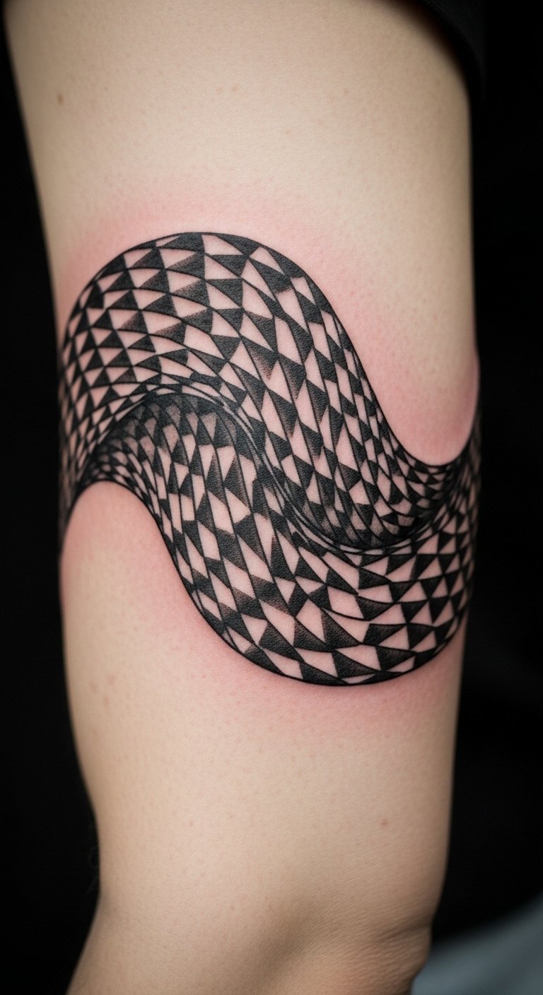 Bands are compact but effective. Biceps offer movement that enhances the illusion. Keep the band wide enough to read the pattern. Mistake: narrow bands lose detail.