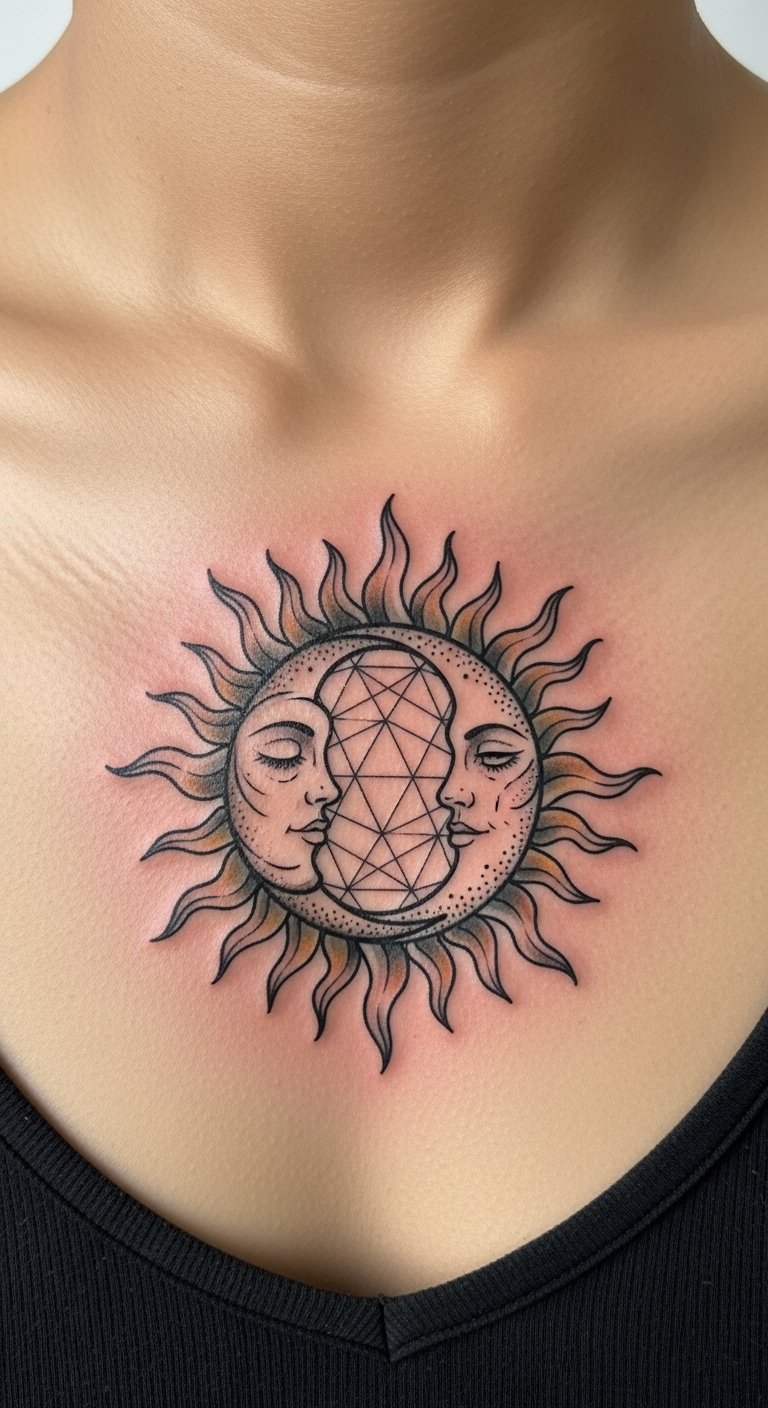 Sun And Moon Geometric Mandala On Sternum