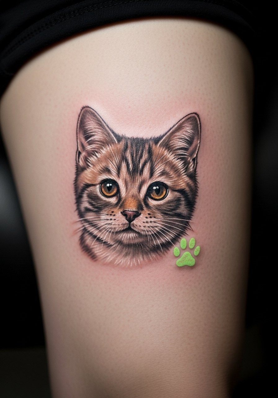 Realistic portraits hold emotional weight. I’ve seen artists add a tiny UV pawprint or name hidden in fur for a second effect. Thigh is forgiving for pain and heals well. Micro-detail needs an experienced hand; blurred detail is the common mistake. Ask to see healed examples of portraits on similar skin tones.