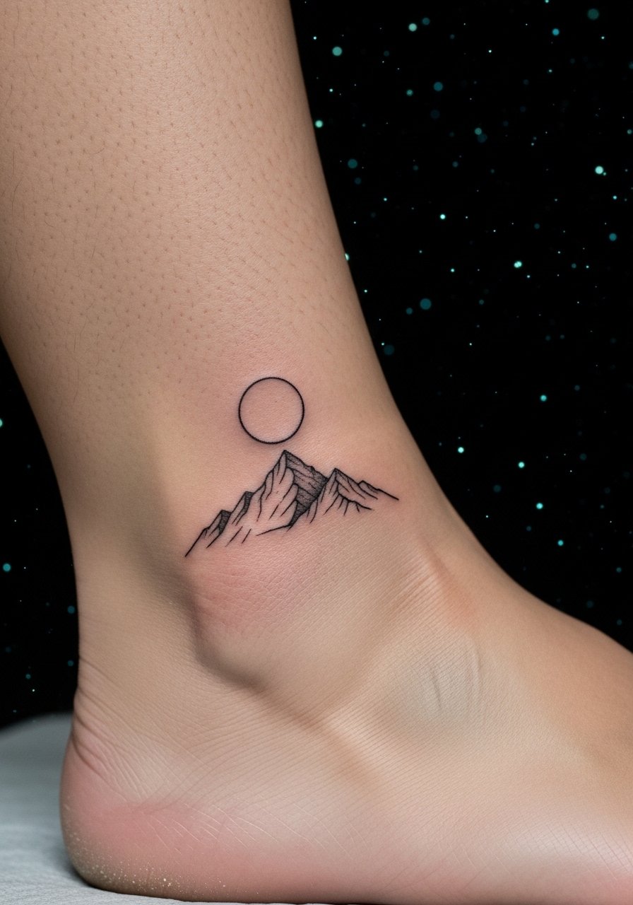 A thin mountain silhouette looks clean in daylight. UV-dot stars above the peaks reveal a night scene under blacklight. Ankles sting more than forearms, so expect a sharper sensation. Keep movement minimal during healing or lines can break. Minimalist work ages fine if lines aren’t overcrowded.