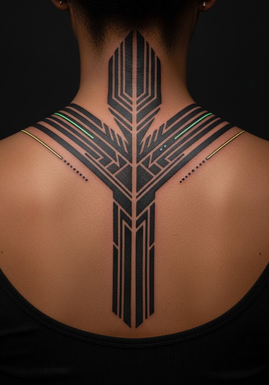 4. Blackwork Geometric Spine Stripe With Glow Lines