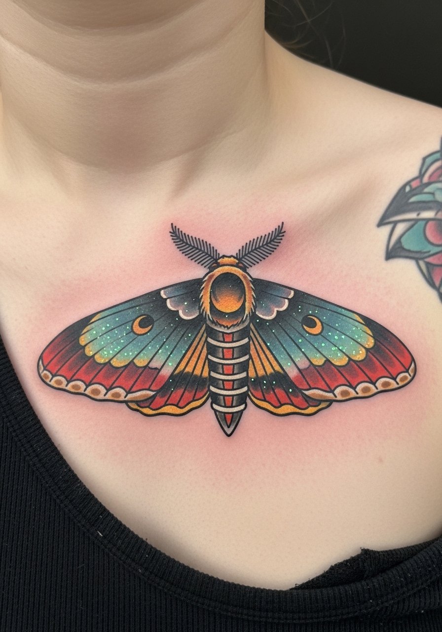A moth with bold shading reads classic. UV speckle on the wing eyes gives a hidden nocturnal effect. Chest tattoos can be sore, especially near the sternum. Color fades faster than black, so expect touch-ups for the UV flourishes. Ask your artist about layering UV over healed color rather than fresh to reduce migration.
