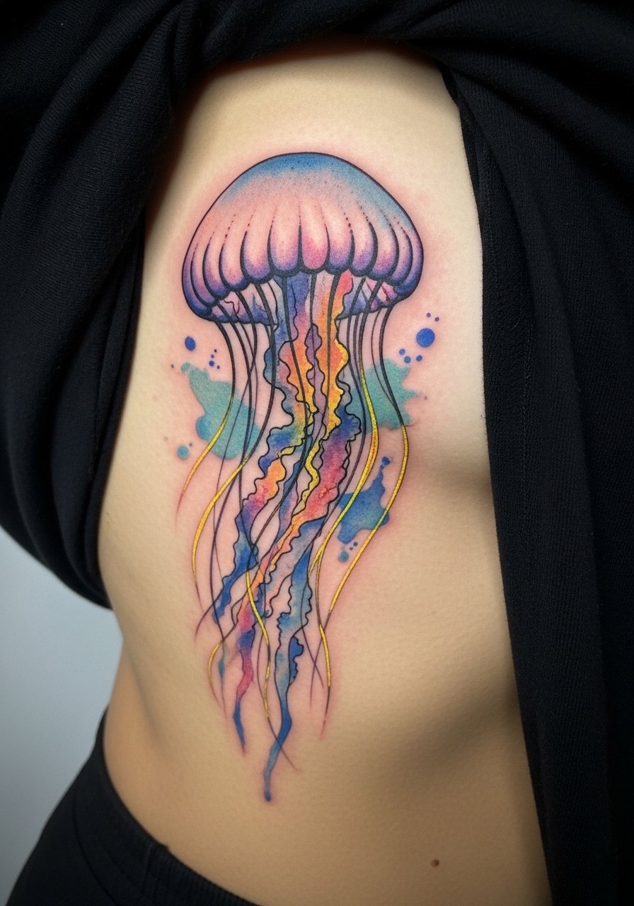 Ribcage is sensitive but perfect for flowing watercolor. UV lines along tentacles create an ethereal glow underwater effect. Healing on ribs needs careful sleeping position. Watercolor fades subtly; artists may recommend occasional refreshes for vibrancy. Avoid too little contrast—watercolor needs dark anchors to stay legible healed.