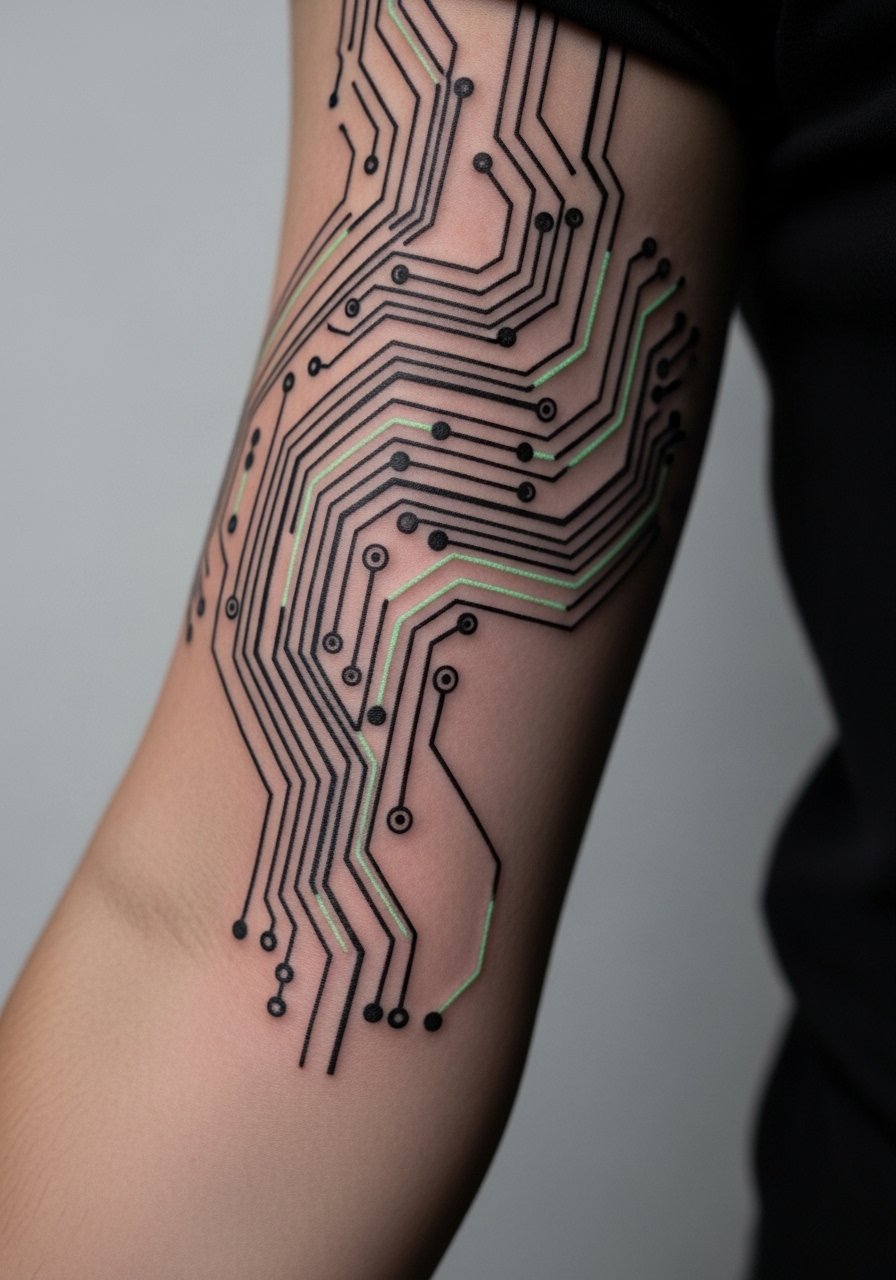 9. Circuit Board Blackwork on Forearm With UV Pathway