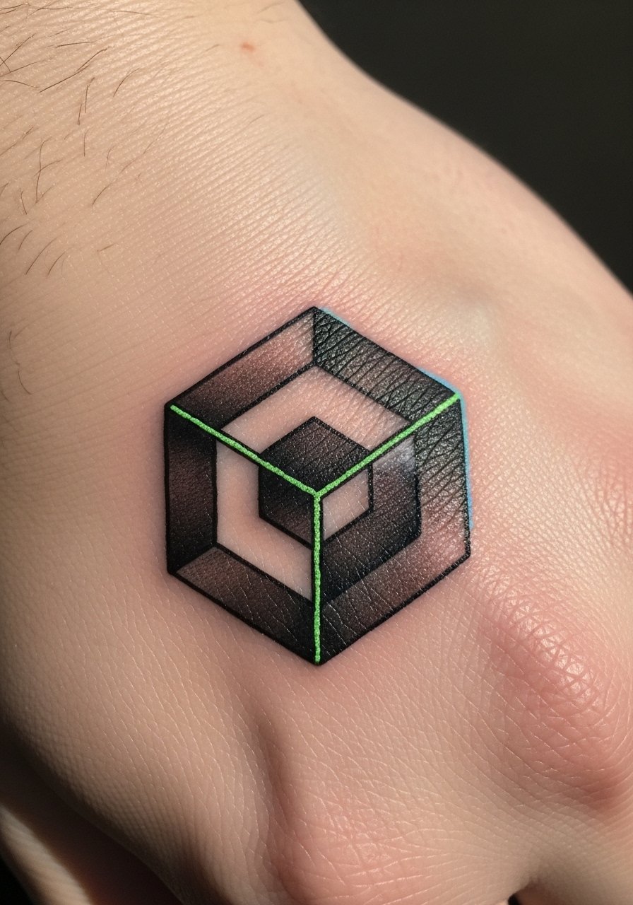 Hands are high-visibility and high-wear. An illusion cube that glows on select edges looks clever both ways. Expect more fading on hands; touch-ups may be needed. Avoid tiny thin details—hand skin moves a lot.