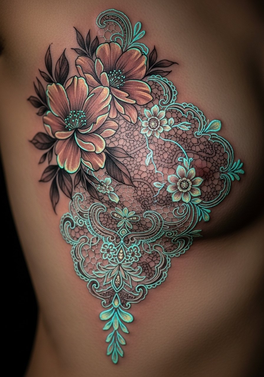 Rib panels can be deeply personal. UV lace detail looks delicate under blacklight. Pain is higher on ribs, so plan breaks. Ask your artist to place UV accents on raised petals where they’ll catch light best after healing.