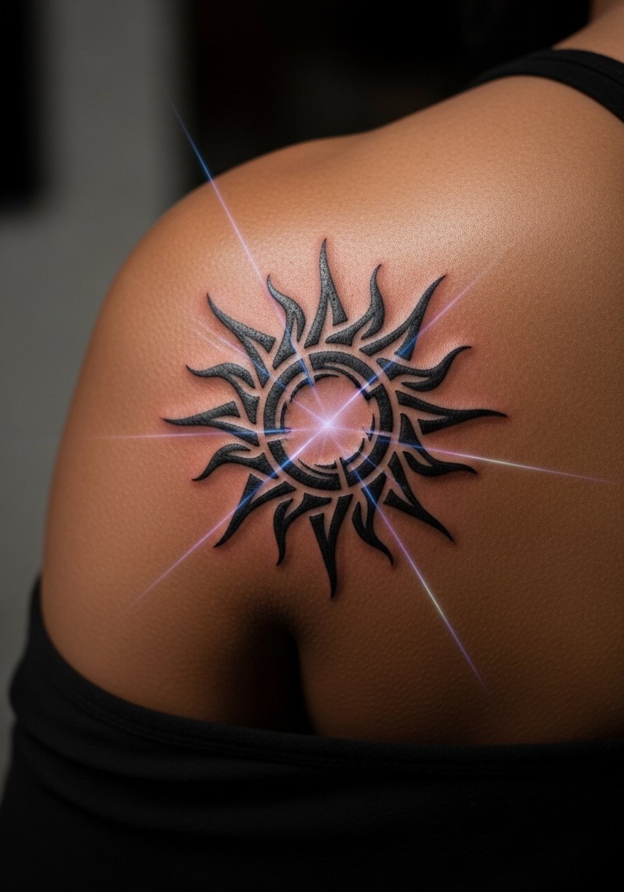 A bold tribal sun reads strongly by day. UV rays add a hidden glow that’s subtle unless you’re under a blacklight. Shoulder blade heals nicely but watch sleeping positions during the first week. Heavy black holds long; UV lines may soften.
