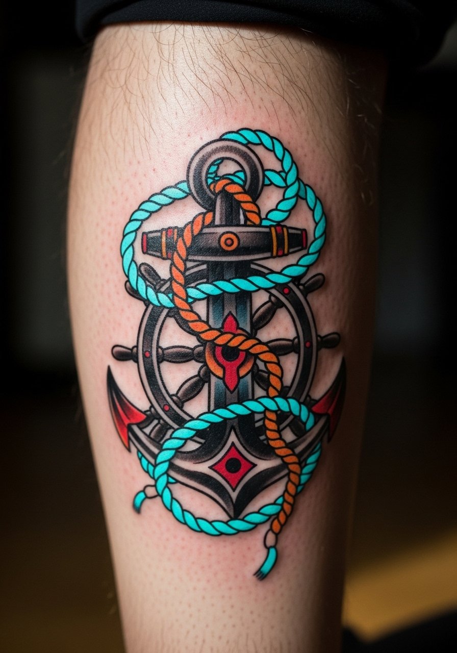 15. Anchor Traditional Small Calf Tattoo With UV Rope
