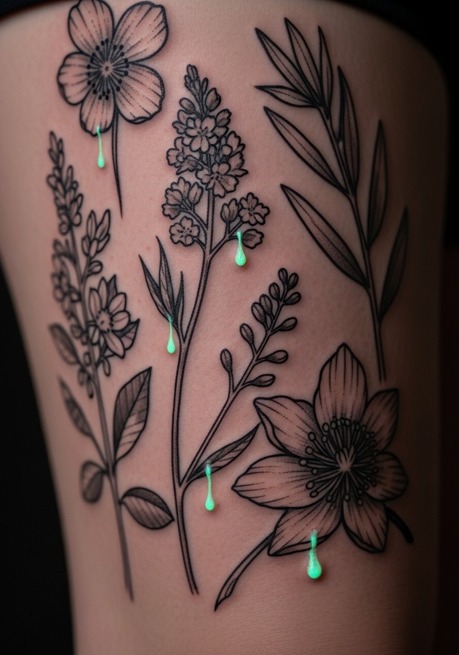 Thighs provide space for lush compositions. UV nectar drops give a hidden detail that only shows in certain settings. Thighs heal predictably; avoid tight clothing during early days to prevent rubbing.