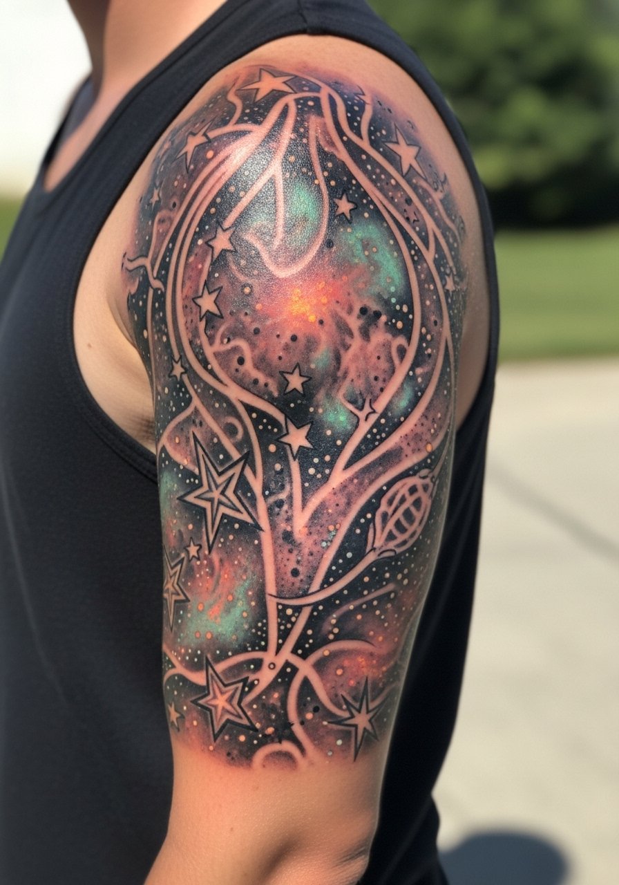 A half-sleeve gives room for cosmic scenes. UV nebula highlights make the piece shift between day and night. Expect multiple sessions. Color saturation matters—ask the artist how they layer UV to avoid muddying colors.
