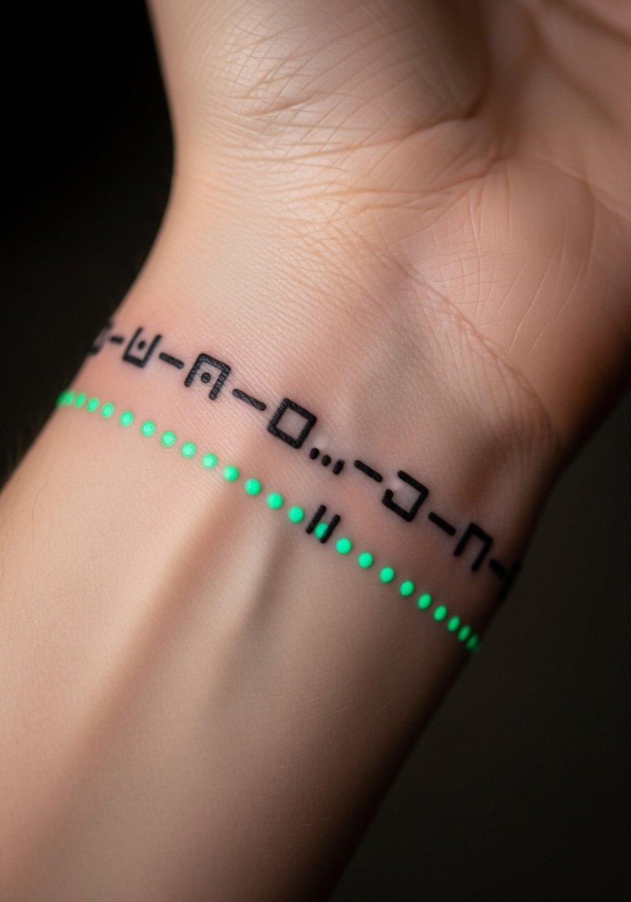 Morse code bands are clever. UV ink can carry the hidden phrase while black ink reads as a pattern. Ensure spacing is deliberate so the code stays readable over time. Wrist motion can affect healing; be cautious.