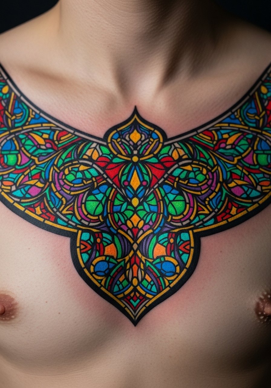 Sternum placement is bold. A stained-glass look with UV lead lines becomes luminous after dark. Pain is significant near the sternum. Color needs saturation and good contrast to read healed.