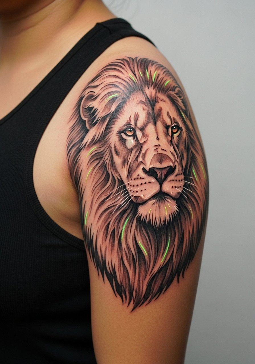 Negative-space animals look graphic. UV mane highlights add drama without changing daytime silhouette. Shoulder placement balances visibility and pain. Ensure large negative areas are intentional to avoid patchy heals.