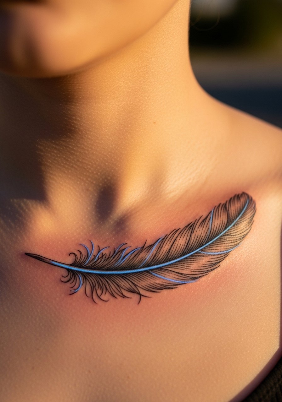 Collarbones are flattering for feathers. A UV quill adds a secret shimmer. Bones make this area sensitive. Ask the artist to keep lines slightly bolder to prevent early blurring.