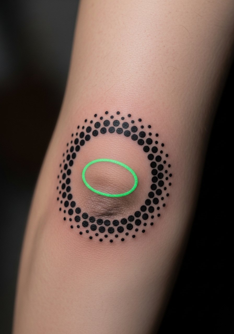 Elbows are tricky; skin stretches and scabs differently. Dotwork halo looks striking by day. UV ring adds a surprise. Expect slower healing and possible touch-ups.