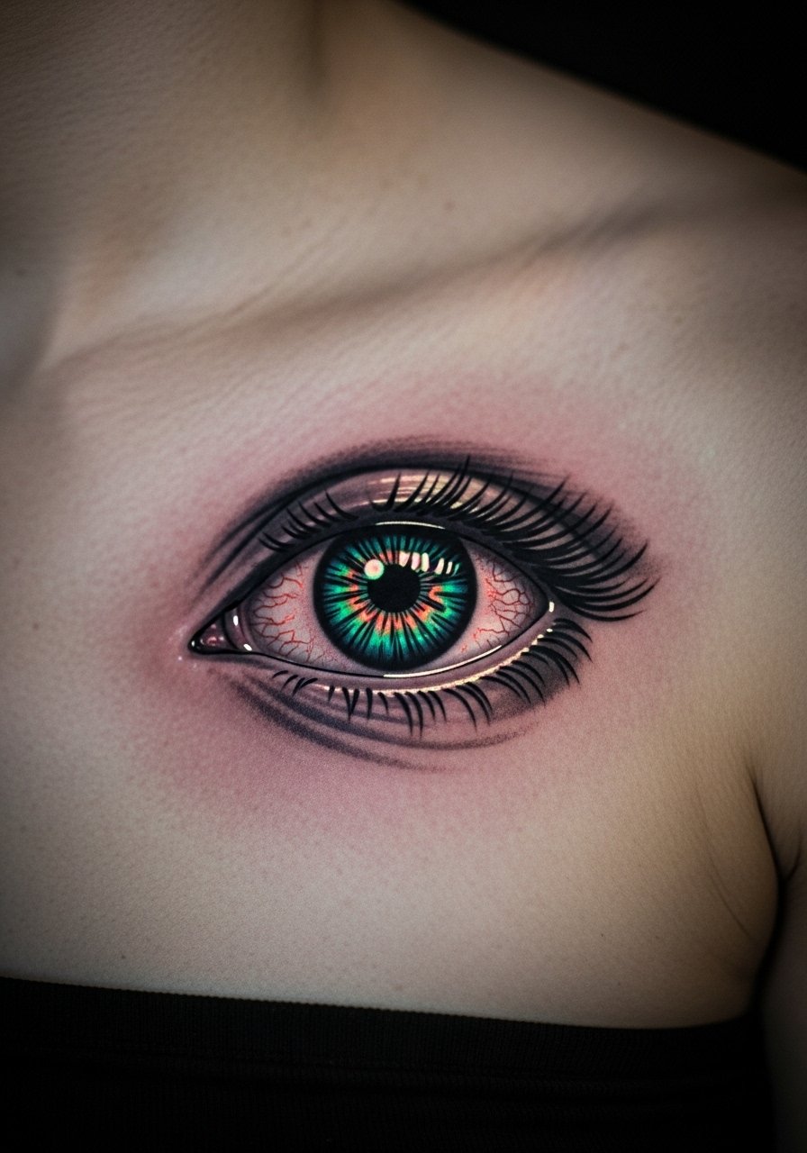 An eye can read symbolic and watchful. UV iris specks give it a second life under light. Chest skin varies; expect tender spots. Ask to see healed eyes on similar skin to confirm contrast.