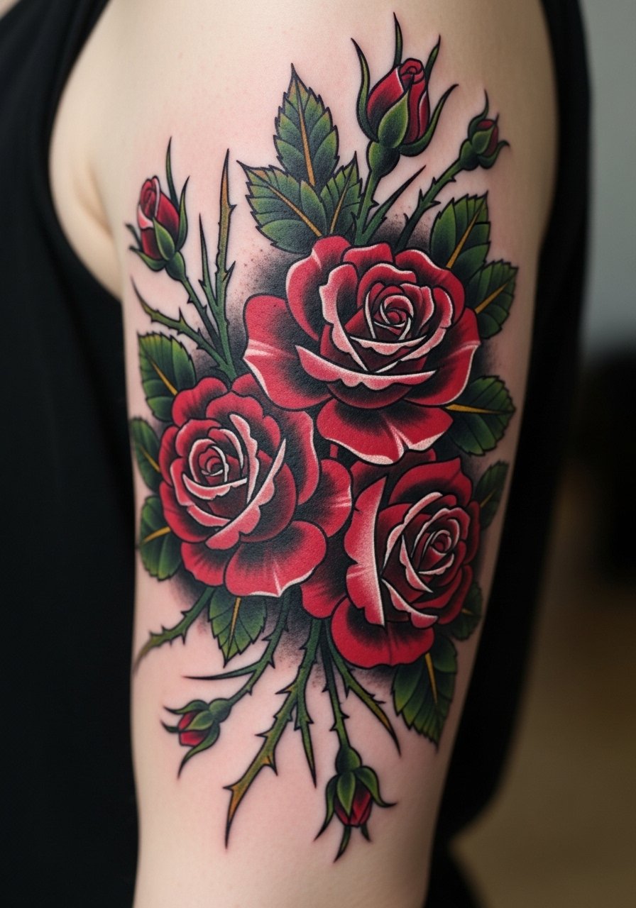 A dark rose bouquet reads Gothic without being literal. I like this placement because the upper arm handles saturation and heals reliably. Heavy blacks and deep reds age well; expect minimal pain and fast sessions. Colors can soften—reds shift more than black—so ask your artist about pigment saturation and layering. The style looks meaningful and classic, and it’s forgiving if you want future additions. Common mistake: tiny petals with thin highlights; they often blur and lose the Gothic silhouette. If you want drama, choose deeper shadows and bold outlines that keep shape as it heals.